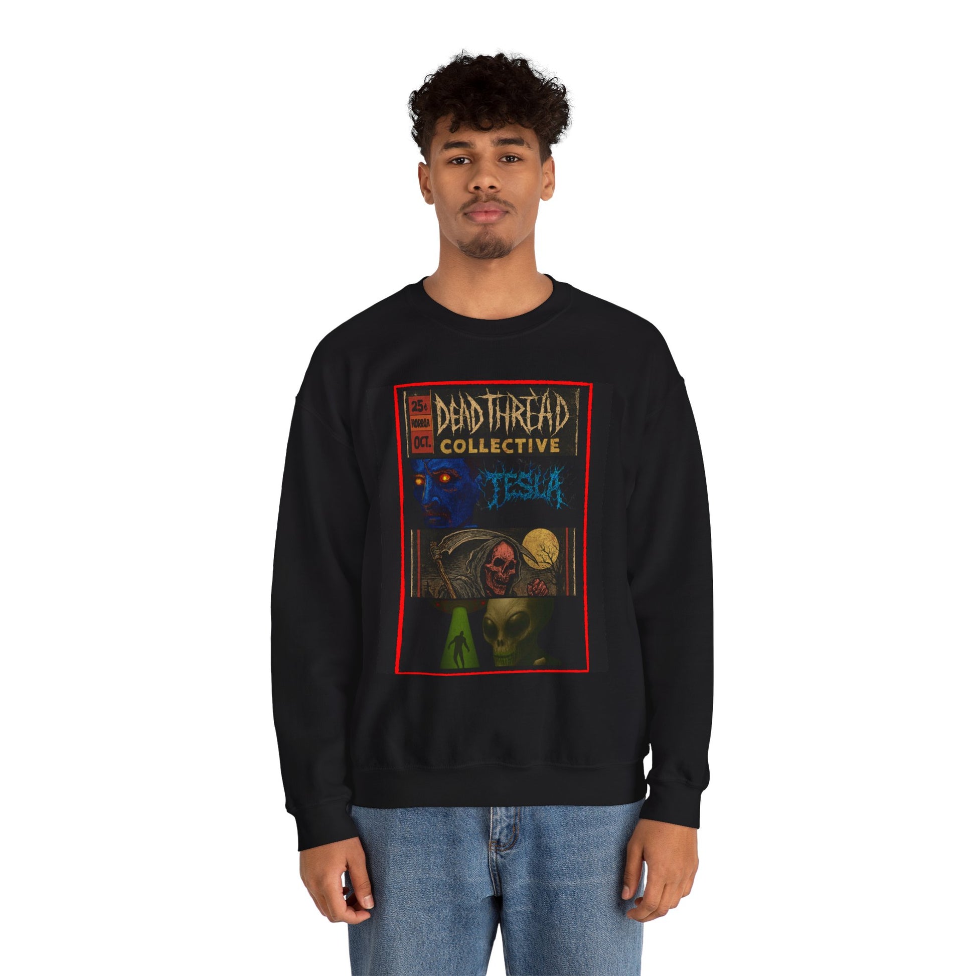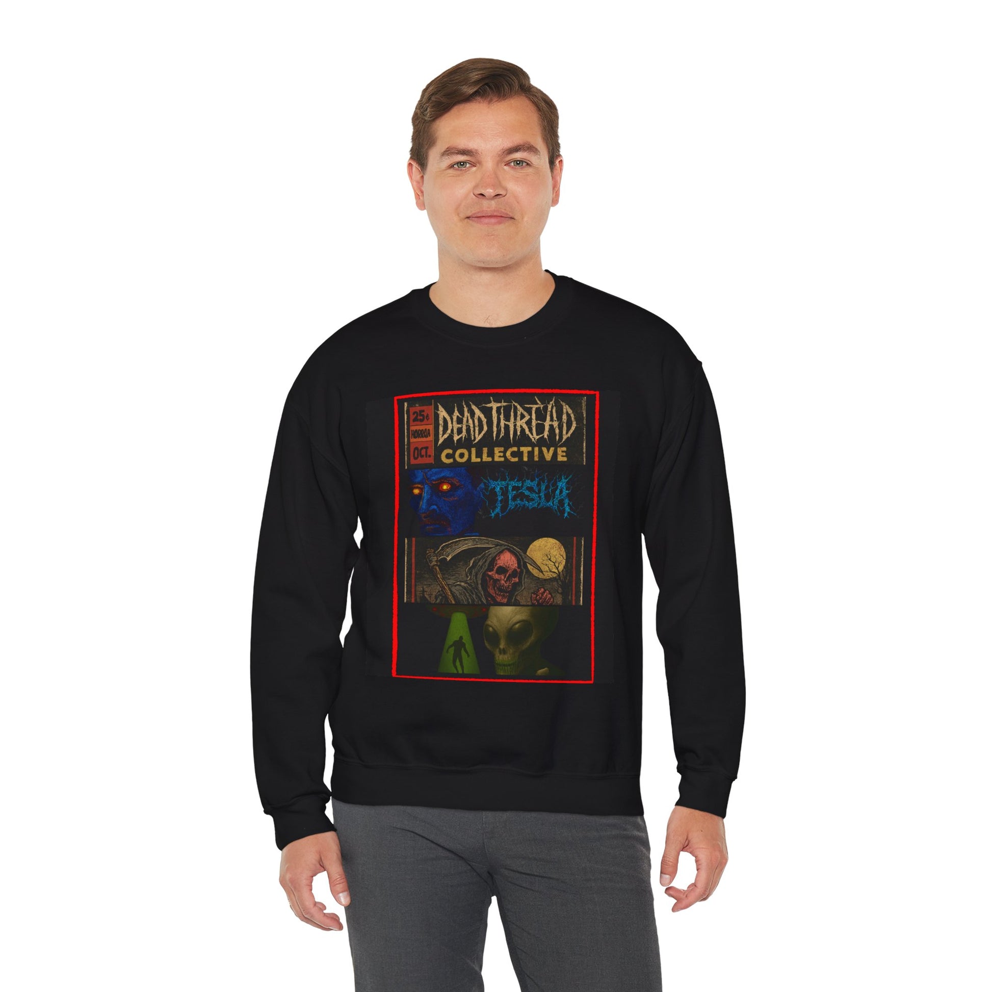 Step into the mythos of Dead Thread Collective with this electrifying sweatshirt drop: Featuring a surreal collage of horror icons - a blue-faced specter, skull-faced rebel, and alien entity - this design channels vintage comic book grit with punk and psychedelic edge. It’s a wearable artifact from a twisted universe. Perfect for fans of cryptid lore, retro horror, and underground style. Printed on premium black fleece for maximum comfort and visual impact.
