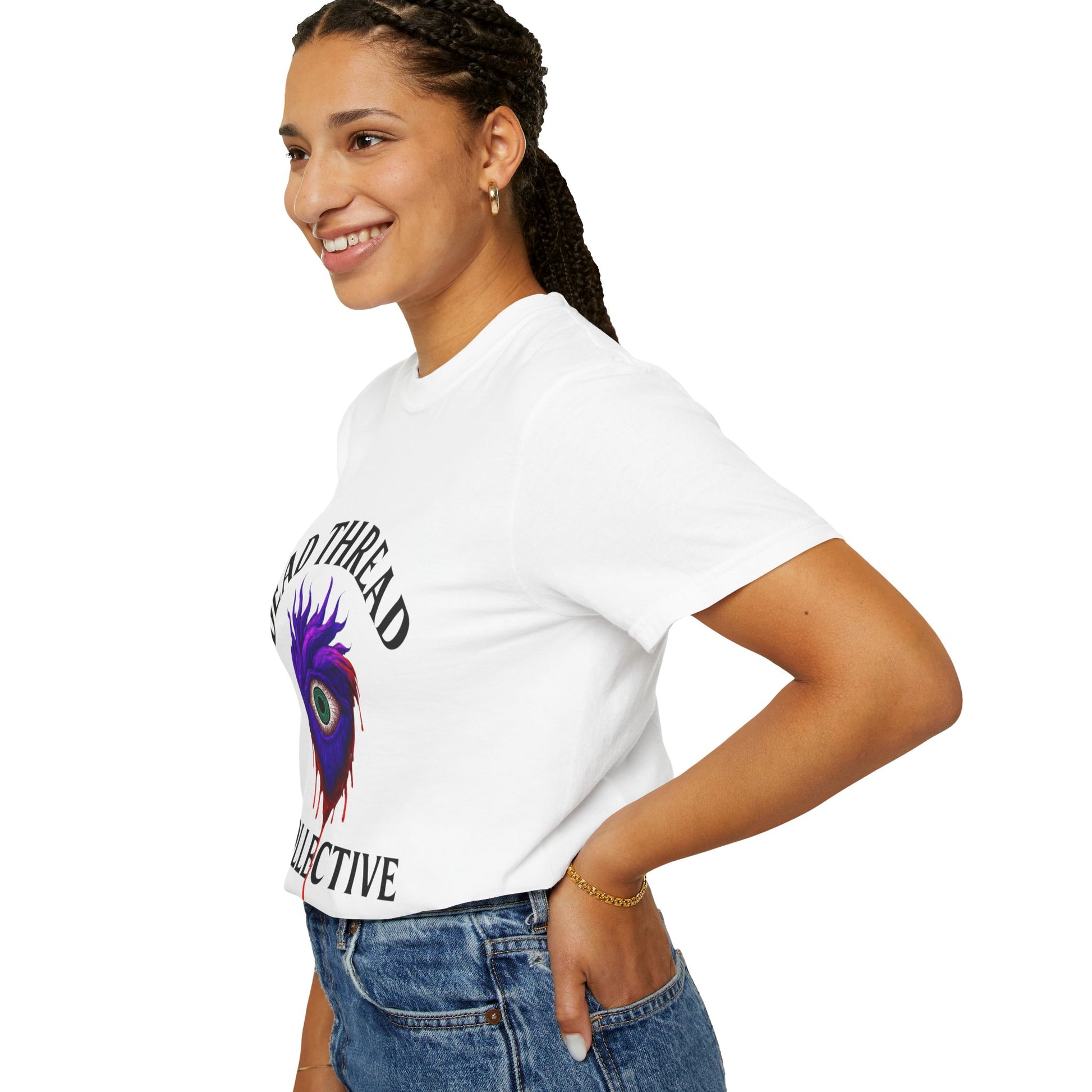 White Dead Thread Collective Brand T-shirt - "Eye of the Heart" Step into the surreal with Dead Thread Collective’s Dripping Eye T-Shirt, a bold fusion of horror streetwear, psychedelic fashion, and alien graphic design. This black tee features a vivid blue eye surrounded by purple flames and tendrils, dripping with eerie intensity. The bold serif “Dead Thread Collective” branding frames the artwork, creating a perfect balance of gothic typography and creepy visual impact.