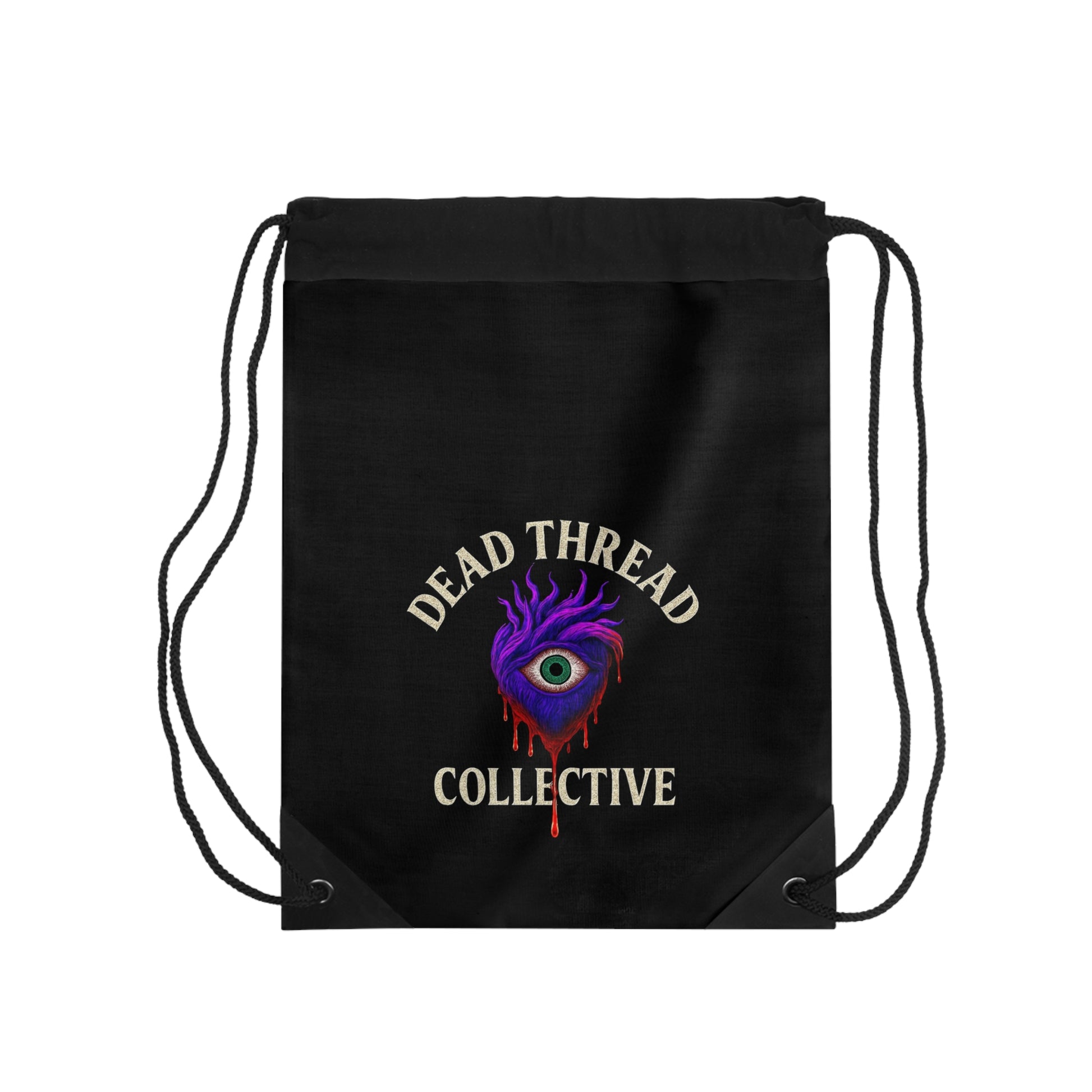 Carry chaos on your back. This black drawstring backpack features the “Watcher’s Flame” sigil—an all-seeing eye engulfed in spectral purple fire, bleeding truth in vivid red. The electric blue iris pierces through the void, framed by the Dead Thread Collective name in stark white lettering. It’s not just a bag—it’s a warning, a beacon, a badge for those who walk the edge.