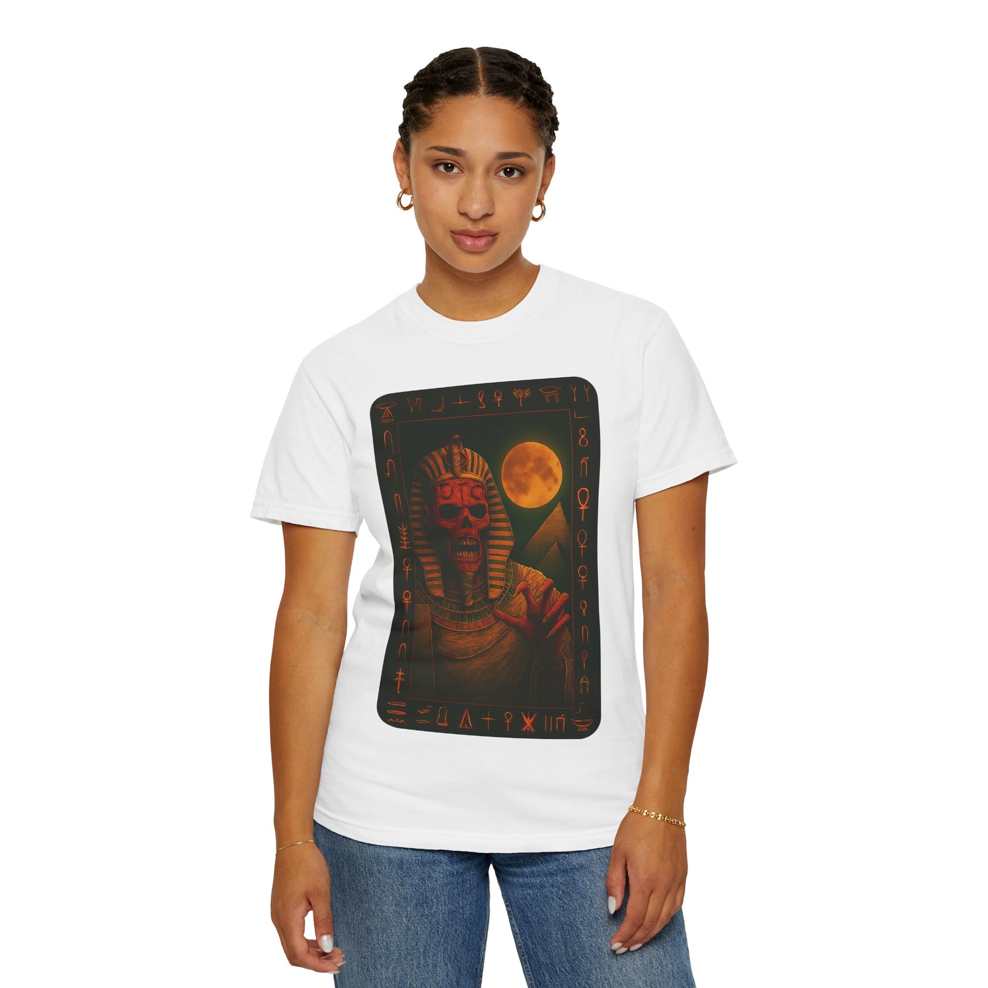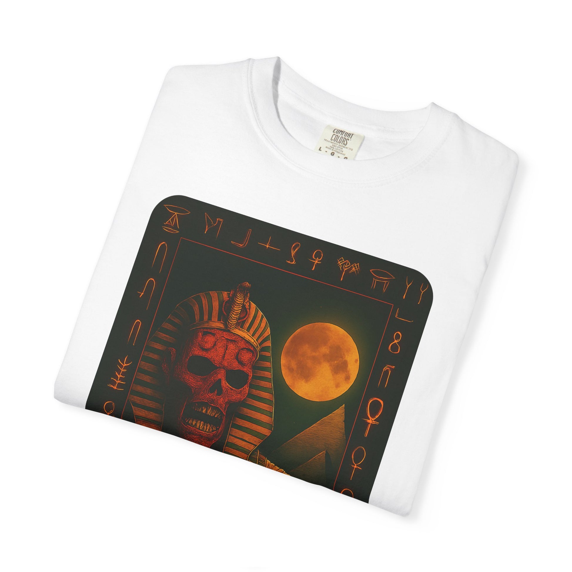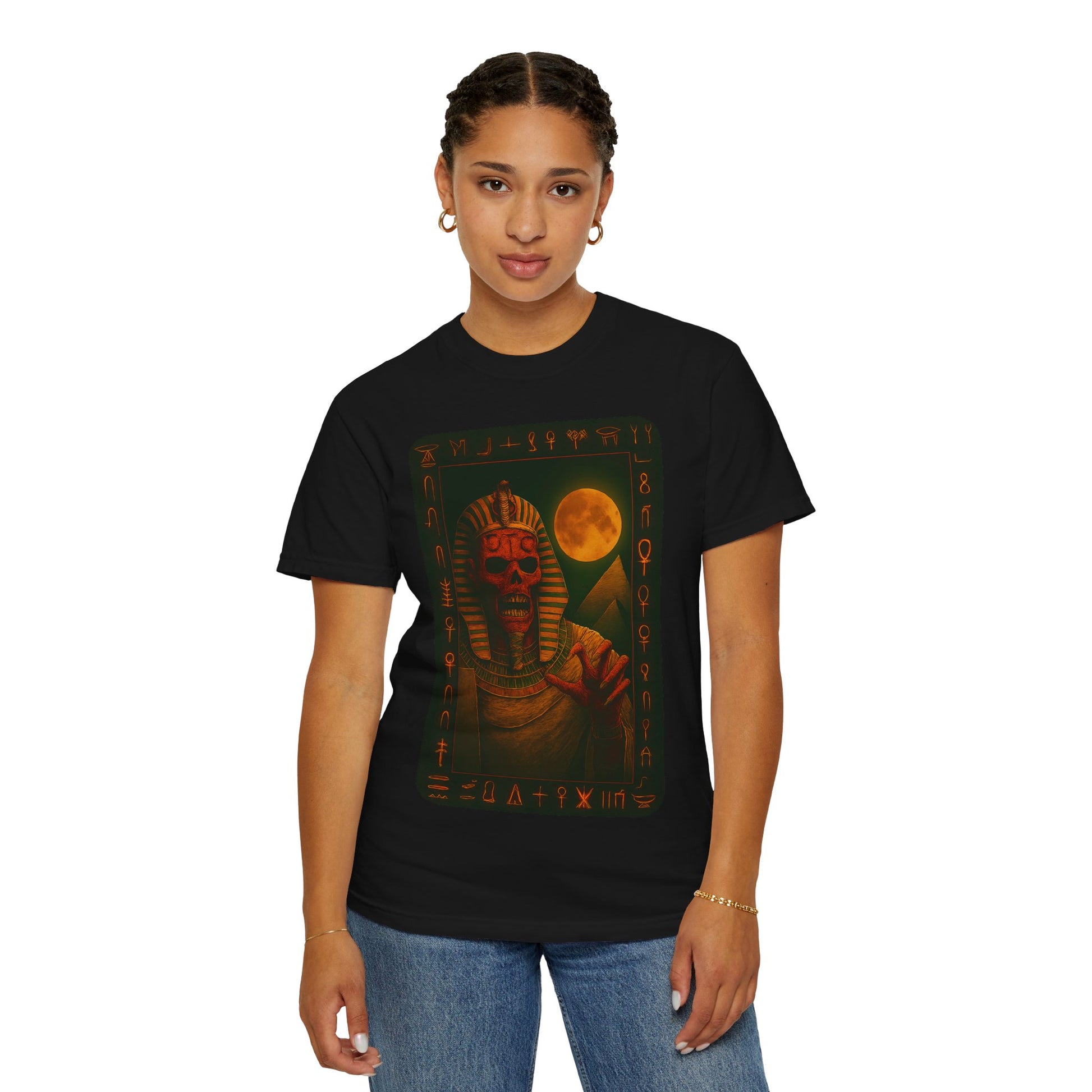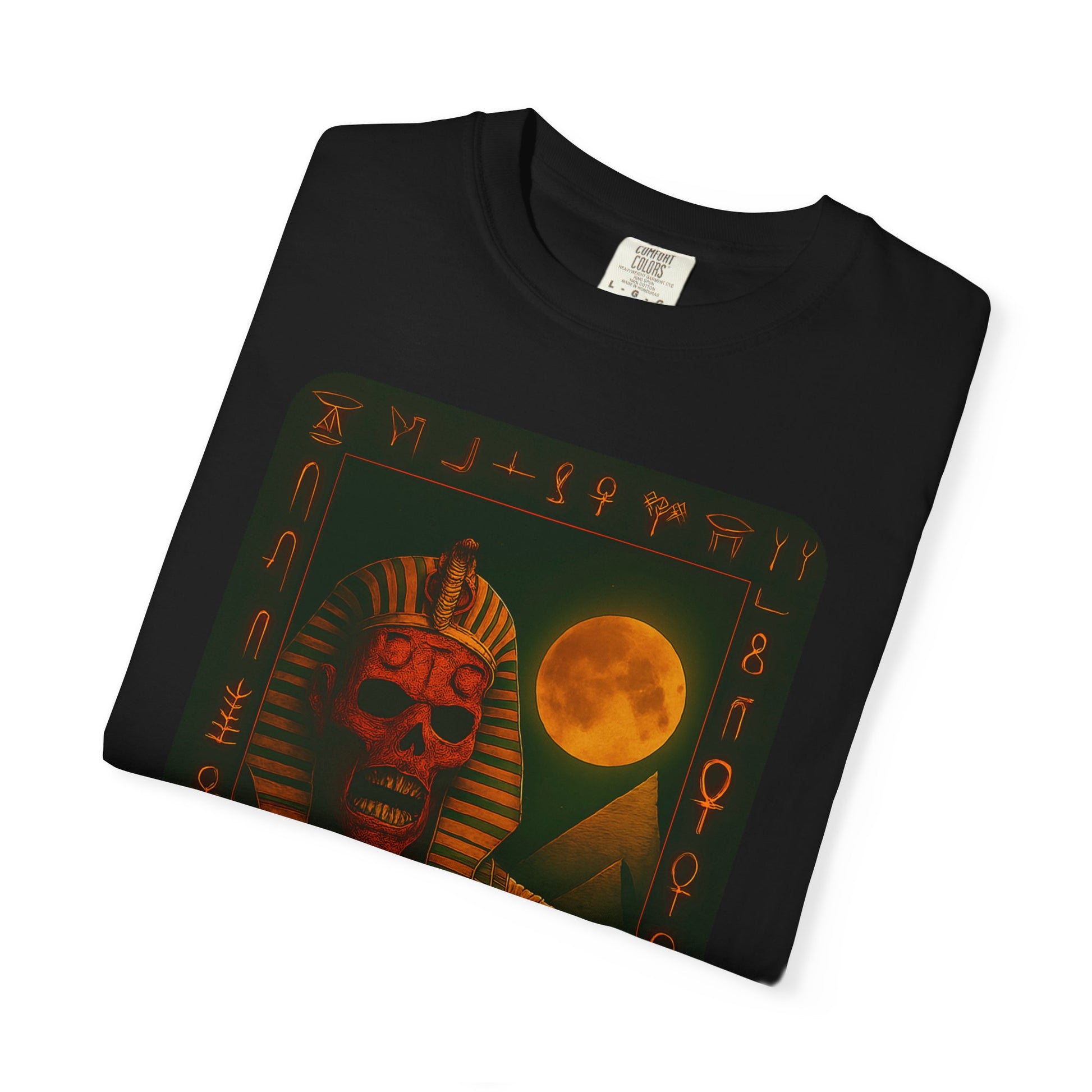 Summon the undead with Pharaoh of the Damned, an original design by Dead Thread Collective. This graphic tee fuses ancient Egyptian mysticism with skeletal horror, set against a blood-orange moon and cryptic hieroglyphic border. Crafted for fans of heavy metal, underground fashion, and edgy streetwear, this shirt is a wearable relic of the macabre. Whether you're stalking the night or headbanging in the pit, this piece delivers high-impact visuals and unapologetic attitude. Designed for horror lovers who crave cinematic detail and bold aesthetics.