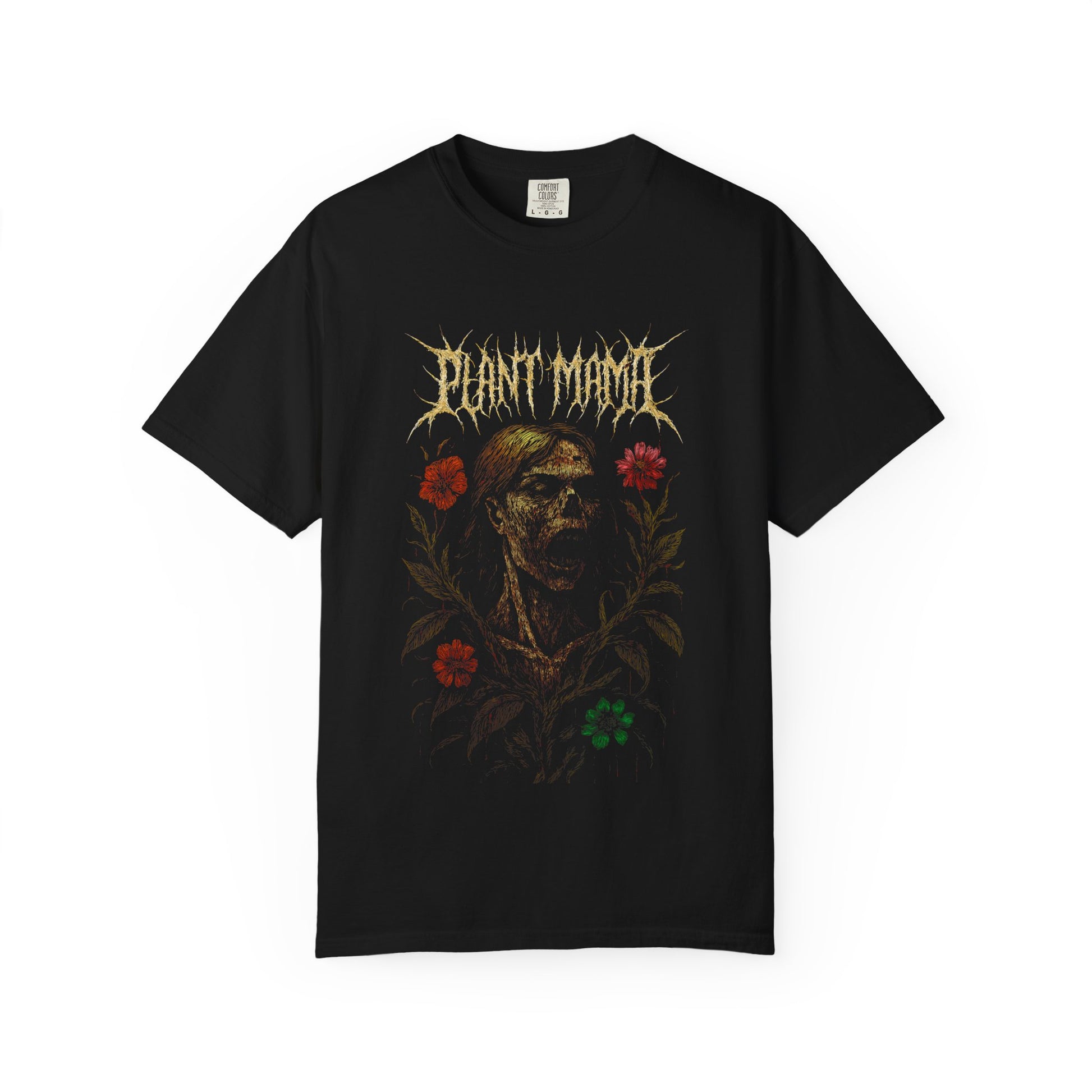 A twisted ode to nature’s hunger, “Plant Mama” merges beauty and decay in a design that’s as haunting as it is unforgettable. At the center is a decomposing figure—part zombie, part earthbound deity—engulfed by blood-soaked vines and vibrant flowers. Her hollow eyes and flayed skin speak of death, while the blooming petals suggest something far more ancient and alive. This piece captures the tension between growth and rot, femininity and ferocity. The jagged death metal-style logo crowns the chaos, making this tee a perfect fit for fans of botanical horror, extreme metal, and unapologetic self-expression. Vivid full-color print with deep reds, greens, and floral accents Intricate linework and high-contrast composition for maximum visual impact Ideal for horror lovers, metalheads, and anyone who finds beauty in the grotesque Wear it as a statement. Worship it as a symbol. Let nature reclaim you.