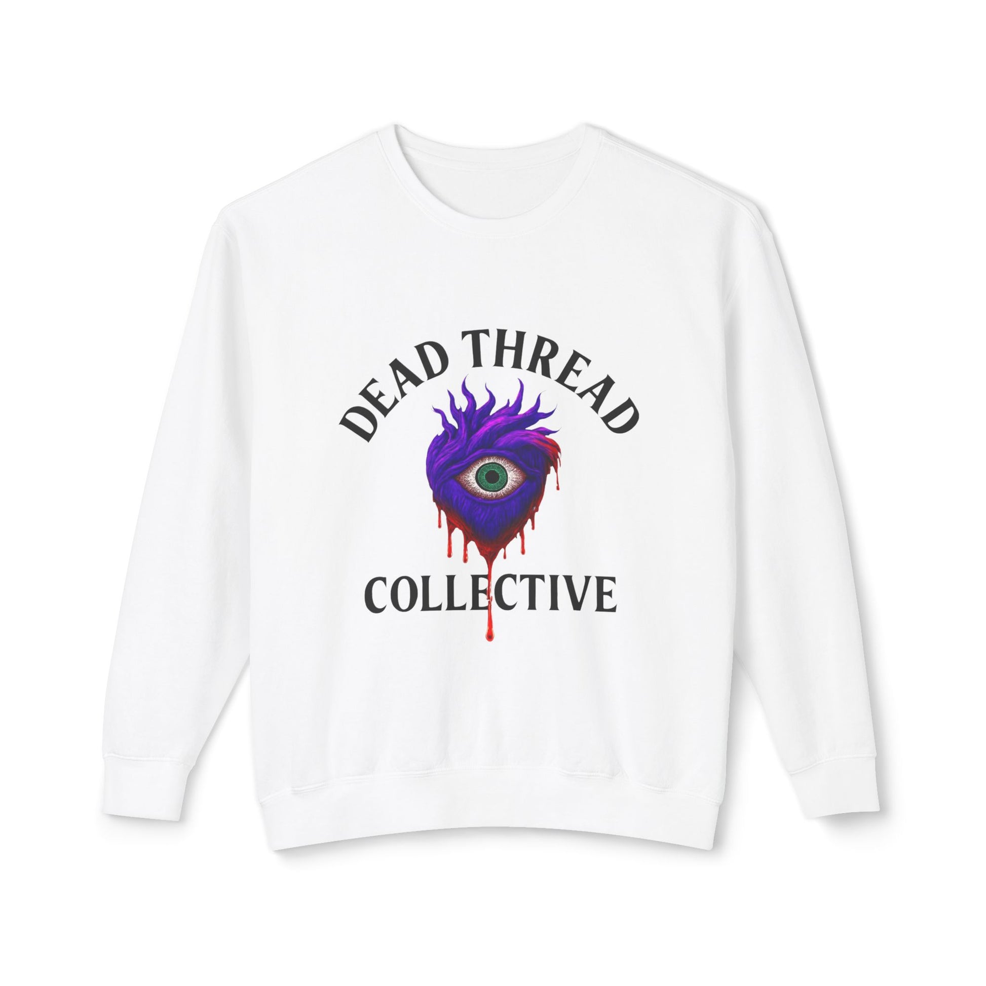 This isn’t just a sweatshirt—it’s a warning. The “All-Seeing Flame” eye sears through the void in spectral purples and blues, ringed with infernal lashes and dripping fresh crimson like it just witnessed something unspeakable. Framed by DEAD THREAD COLLECTIVE in stark black lettering, this piece hits like a cursed broadcast from the underworld.
